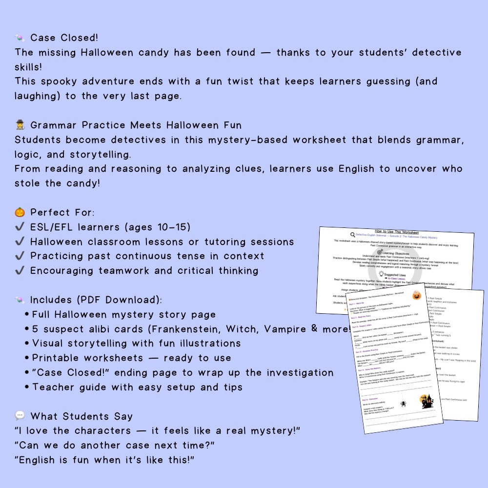 Students must read the story, examine each suspect’s alibi, and use Past Continuous grammar clues to solve who really took the candy!